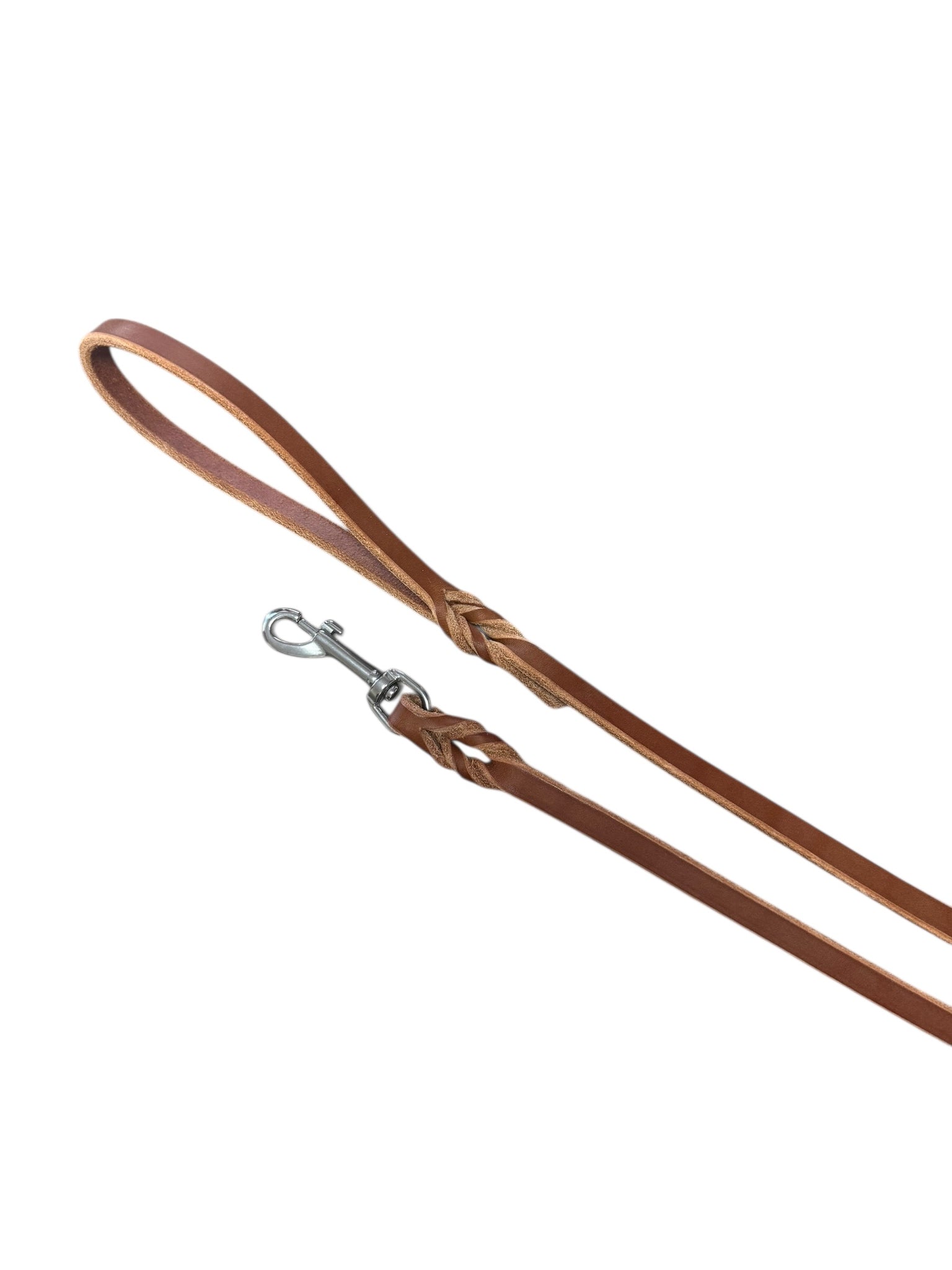 Elevate your small dog or puppy's outings with our hand-braided leather leash. Carefully designed with delicate companions in mind, this leash features premium 12-13 oz English bridle leather and sturdy stainless steel hardware. The intricate braiding adds a touch of artistry, while the durable materials ensure peace of mind . Make every walk a special moment with your furry friend, combining elegance and reliability in one beautifully crafted leash.